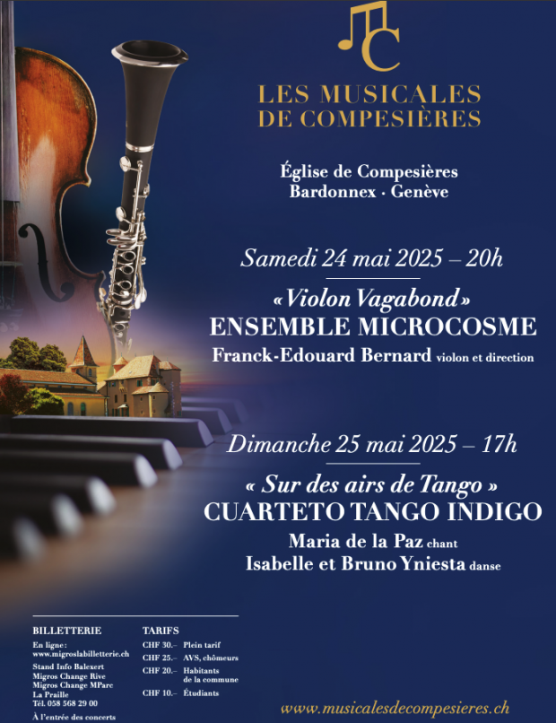 Les Musicales de Compesières nous proposent deux concerts cette fin de semaine, centrés samedi 24 sur le thème "violon vagabond" et dimanche 25 mai sur des airs de Tango (voir ici).