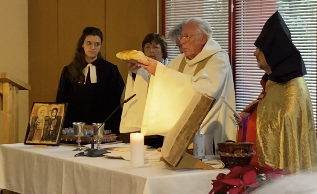 Belle et émouvante fut alors, après le geste de paix, la concélébration de la Sainte Cène, du Sacrement de l'Eucharistie par Xavier Lingg, les pasteurs Blaise Menu, Eloise Miceli, le père Goossan Aljanian et Isabelle Hirt, notre animatrice pastorale dont chacun apprécie la conduite des célébrations d'adieu. Partagée par toutes et tous fut la communion sous les deux espèces.