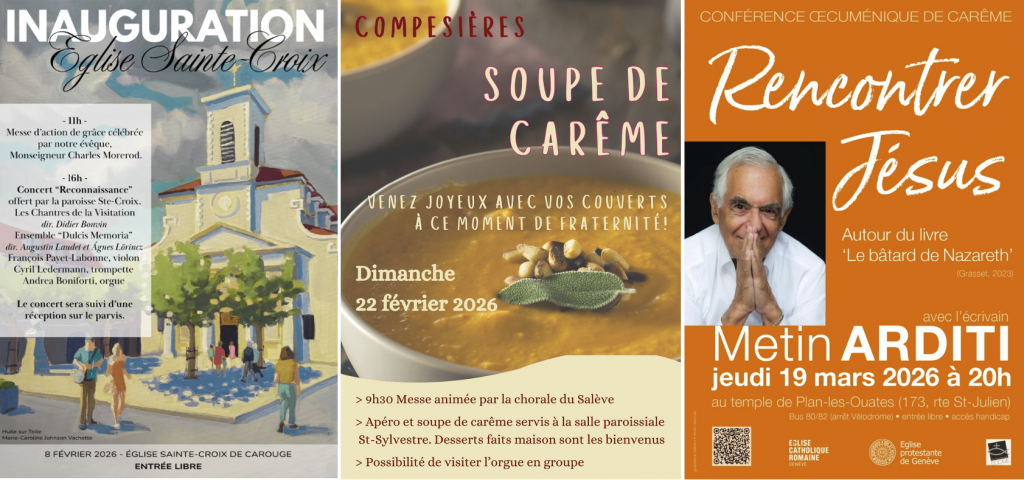 La conférence de Carême œcuménique aura lieu jeudi 19 mars à 20h au temple de Plan-Les-Ouates. L'écrivain Metin Arditi abordera le thème « rencontrer Jésus », discussions et échanges autour de son livre « le bâtard de Nazareth » (Grasset, 2023) Ouvert à tous et à toutes. Entrée libre.