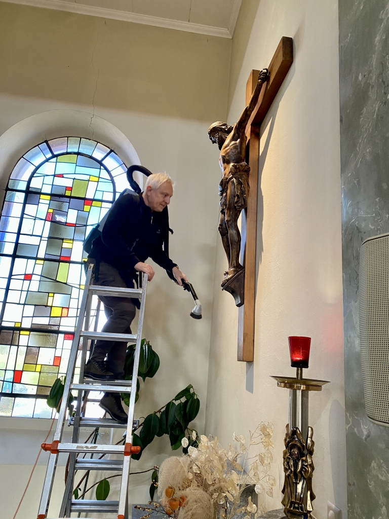 C'était la Saint-Joseph ce jeudi, un jour férié en Valais et dans quelques autres régions (il y avait une messe à Sainte-Croix annoncée sur le site de notre UP). A Compesières, une poignée de paroissiens sous la gouverne de Gisèle n'a pas ménagé sa peine et a nettoyé les chaises de l'église collant sous chacune de leurs quatre pieds des tampons en feutre. Ce fut l'occasion aussi de passer un coup de chiffon sur la statue de Marie et sur le crucifix. Les accordeurs de l'orgue avait pris une semaine de vacances, permettant aux Musicales de donner deux concert ce samedi 21 à 20h et ce dimanche 22 à 17h