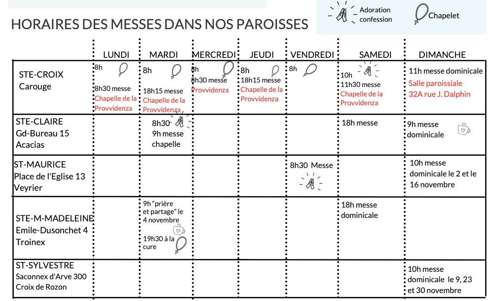 Le site theodia.org, créé à Fribourg, recense des milliers d'horaires de messes dans le monde. L'agenda de notre paroisse est disponible en téléchargement ici. Notre UP publie régulièrement les horaires des messes et autres événements sur upcsa.ch ainsi que dans les Infos paroissiales mensuelles. Consultez également l'agenda de l'Eglise catholique à Genève.